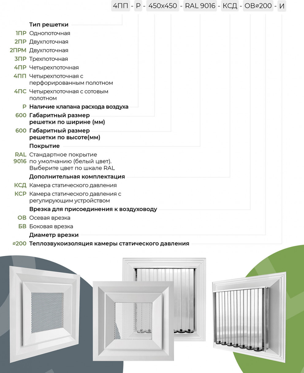Решетка выполнена из алюминиевого профиля, представляет собой раму и центральное полотно, состоящее из жалюзи и перфорированного листа.Полотно является съёмным, что способствует быстрому и простому монтажу. Наклон жалюзи к лицевой поверхности равен 30°.